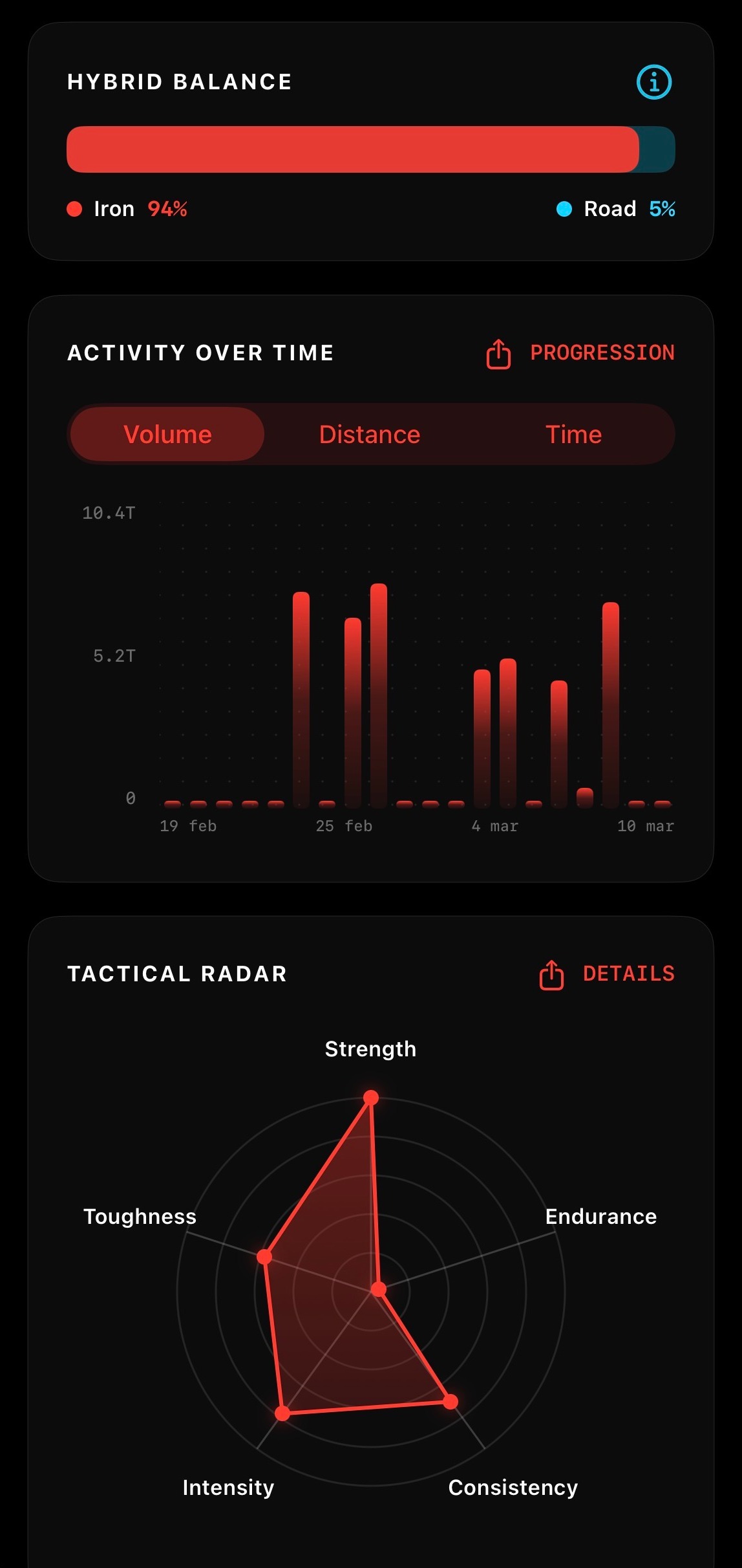 Overview, Strength, Hybrid. Load, Endurance, Consistency, Intensity. One dashboard.