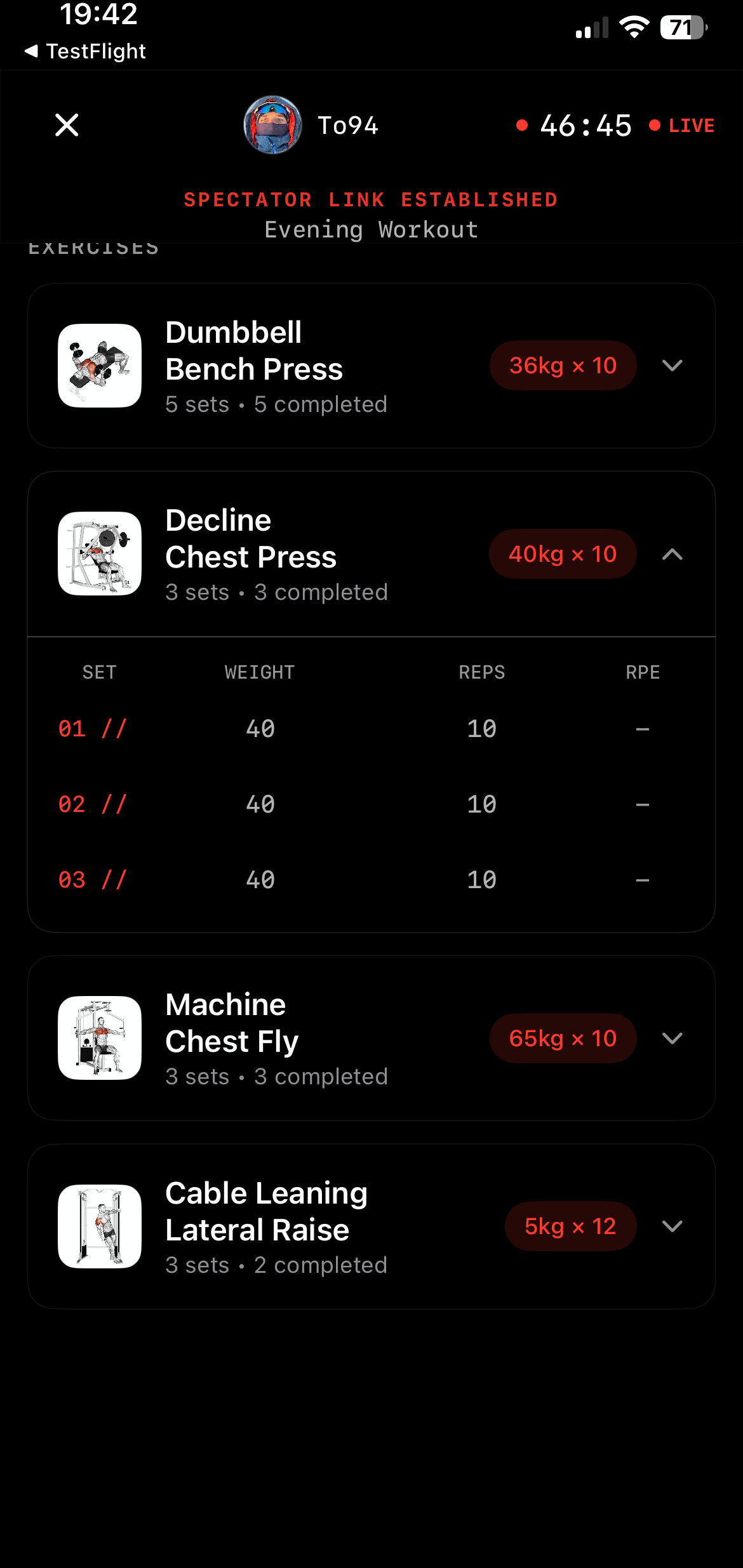 Watch a followed athlete's session in real time. Read-only Spectator view with live sync — sets, rest timer, and run data. Your crew sees you; you see them. Terminal vibe, no fluff.